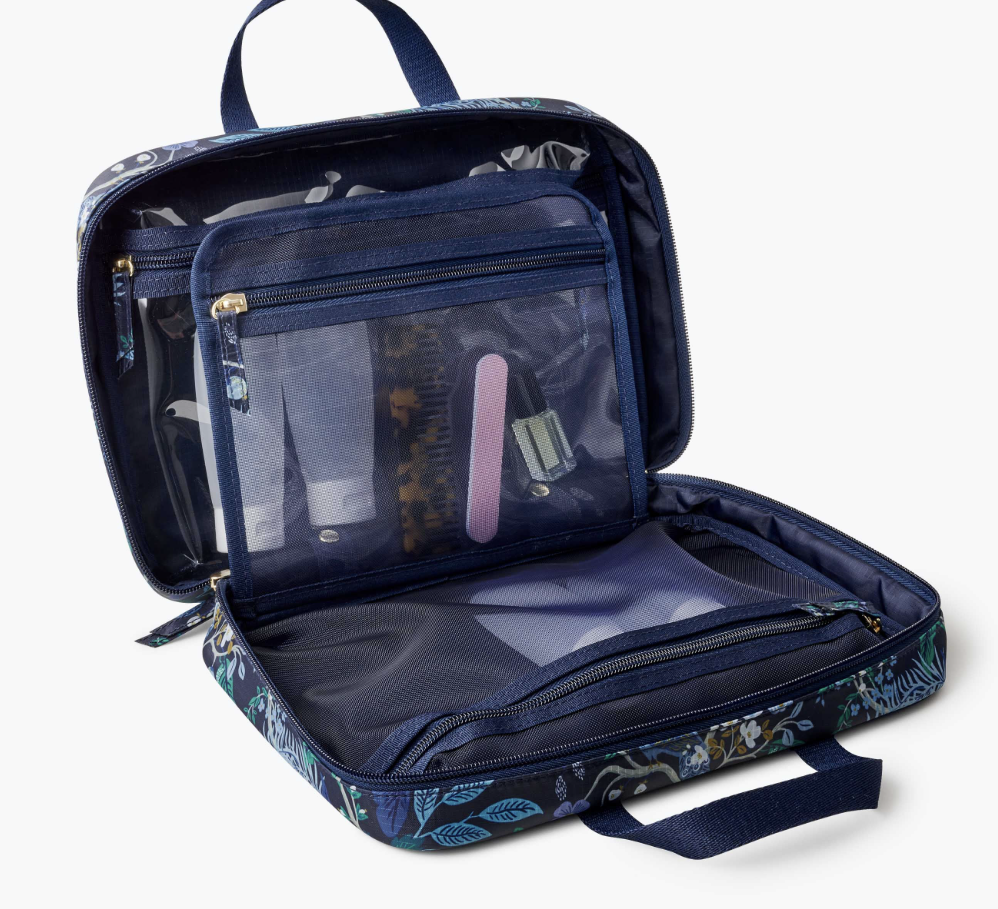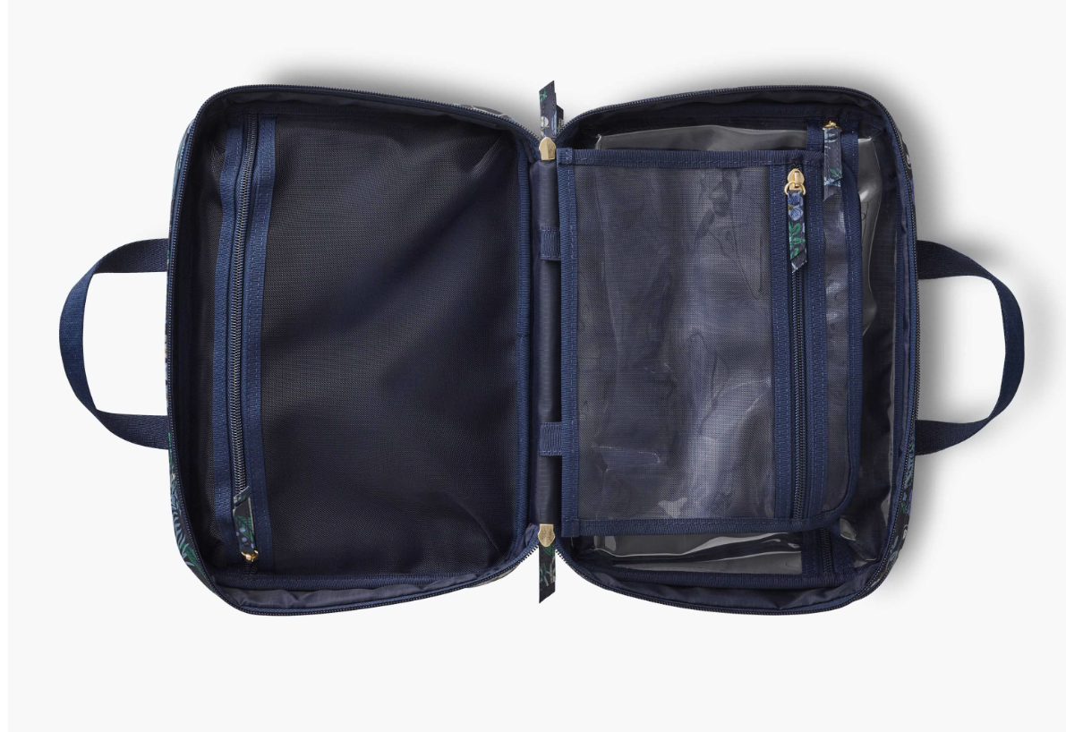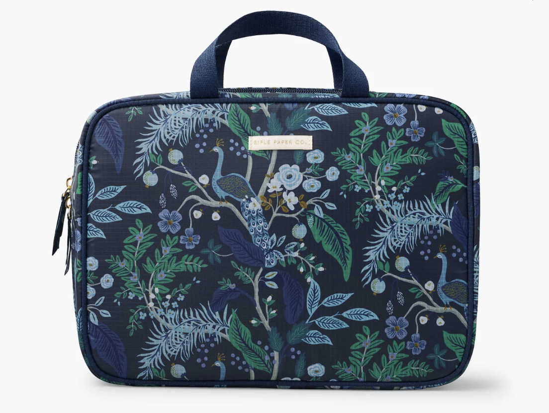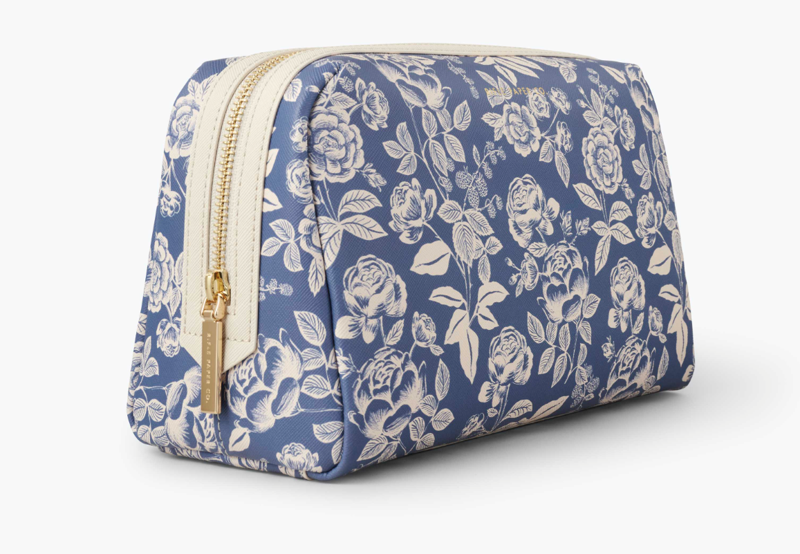 Tuck away cosmetics, toiletries, or brushes at home or while you travel in our English Rose small cosmetic pouch. Made from a structured material with a textured finish and a wipe-clean lining, it will hold up to everyday use. A wide opening makes it easy to see what’s inside, and the brass zipper and pull add a perfect finishing touch.